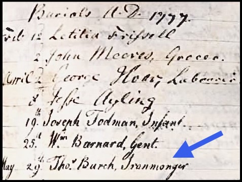 Thomas Burch wrote his Will on 1 March 1775 and he died in Petersfield at the end of May 1777, age 59. He had lived his entire life in Petersfield and his father, Henry Burch, had been a Petersfield Inn Keeper. Thomas Burch was listed as a husbandman on his marriage licence when he married Jane Willmer of Farnham in 1746. He was a part-time schoolmaster at Churcher’s College as well as owning a cutlery-making business, and a bookbinding and bookselling business. In his Will, Thomas styled himself as a ‘Book Seller of the Borough of Petersfield’ but the Petersfield Vicar recorded him as ‘Ironmonger’ in the burial records. Clearly, a man with diverse business interests!