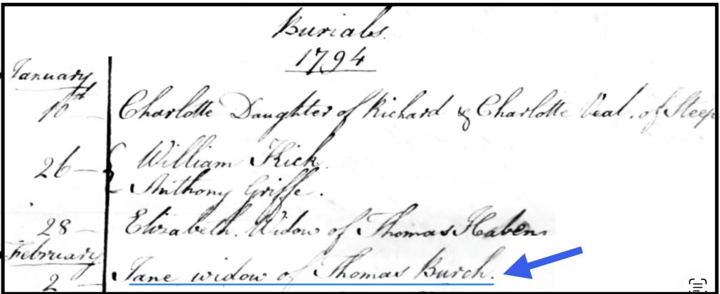 Jane Burch had been born Jane Willmer, daughter of Richard and Mary, in Farnham in 1715, growing up in her father’s worsted making business in the Dogfludd area of the town. After her marriage to Thomas Burch, Jane had to endure the disappointment of one baby after another dying soon after birth. After her husband Thomas died in 1777, Jane continued in widowhood in Petersfield for a further seventeen years. She was supported through the income derived from her Farnham property and from her husband’s businesses that were now being run by her nephew, Thomas Willmer. Jane wrote her Will in 1790 and died at age 79 in 1794. Amazingly, her status was recorded in the Petersfield Parish Register as ‘the widow of Thomas Burch’ seventeen years after his death!